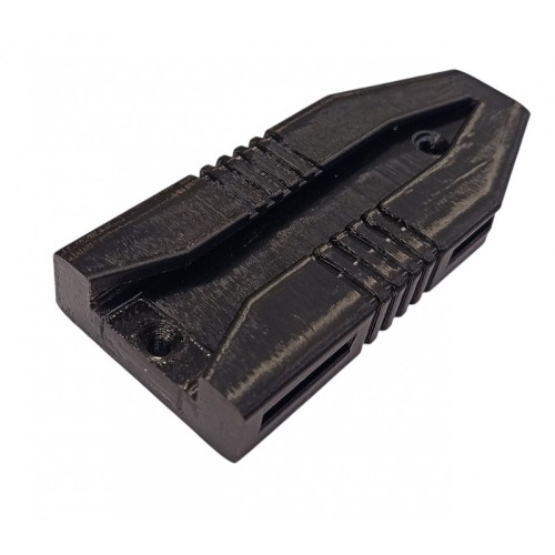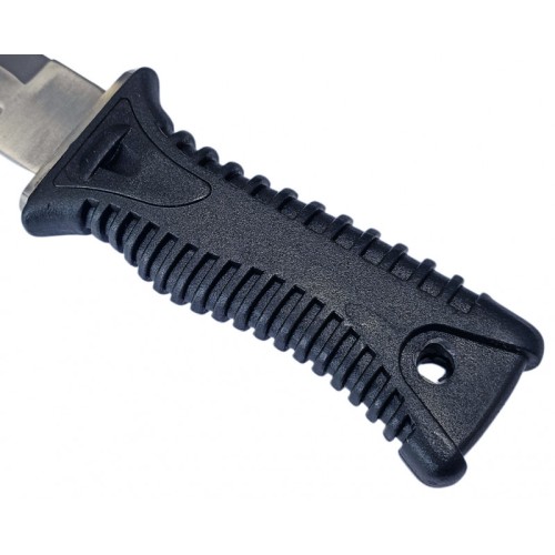 Эргономичная объемная рукоятка из прочного пластика с ребристыми гранями обеспечит надежный хват, даже в мокрых руках. Важной особенностью ножа является его система крепления: ножны изготовлены методом 3D-печати из качественного пластика. Внутри встроен магнит для удержания ножа, что облегчает извлечение в стрессовых ситуациях без лишних манипуляций кнопками и зажимами. Но, так же имеет в комплекте темляк, который можно накидывать на ножны для дополнительной фиксации.